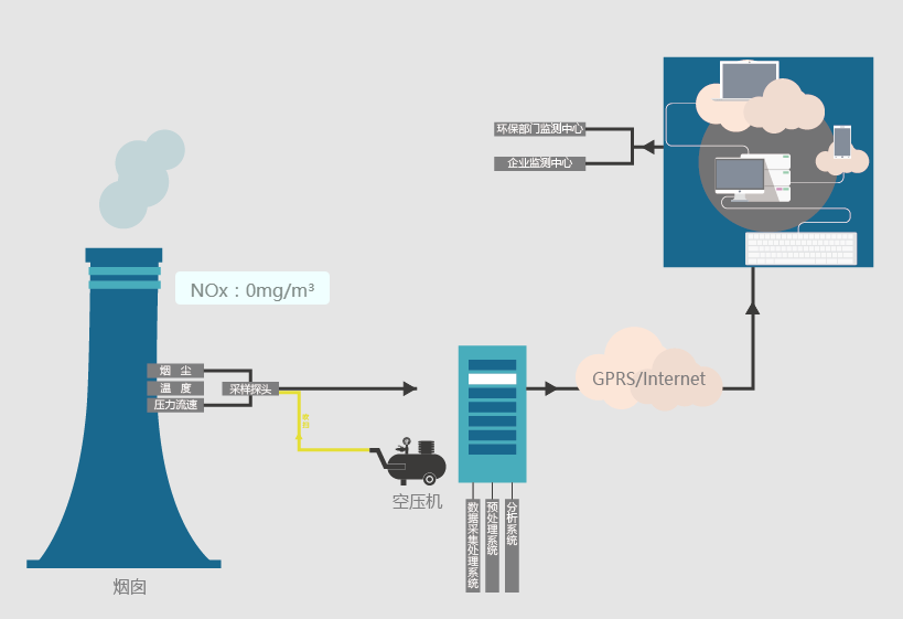 此项目采用我司自主研发的JXHB V1.0智慧环保管理系统,是采用进口元器件设计的连续监测系统。此次项目主要监测污染物氮氧化物(NOx)等。单套监测系统采用监测平台探头+预处理+工控机+液晶显示器+数采仪的架构模式完成对监测数据的接收、存储、显示、传输的功能要求。前端在线监测系统主要有以下意义: