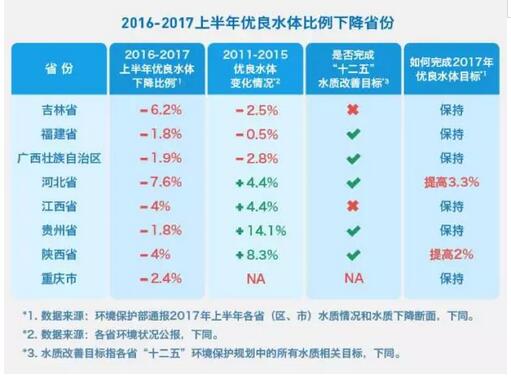 4.2017上半年出现下降的省份中,吉林、江西没有完成“十二五”水质改善目标,重庆“十二五”水质信息公开不完整。