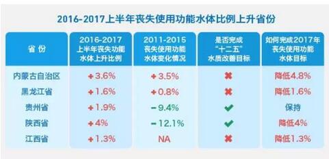 5.要实现2017年目标,内蒙古、黑龙江、陕西和江西4省分别需在2017下半年将丧失使用功能水体比例降低至少4.8%、1.6%、4%和1.3%。